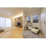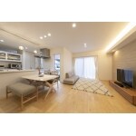 LDKを広く取り、リビングの⼀⾓にお⼦様の遊べるフリースペースを設けました。 キッチンを対⾯にし、お⼦様の様⼦が⾒れ安⼼して家事をしていただけます。 キッチンから洗⾯所への新たな導線を確保したことにより、家の中に回遊導線が⽣まれ、⽔廻りのアクセスが良くなりました。 テレビ台の背⾯にはエコカラット、上部に間接照明をつけ、シーンによって雰囲気を変えれるようにしました。