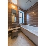 少しずつ水廻りを移動して、1216から1416へサイズUPした浴室はノルディグレーウッドを4面貼の暖かみのある浴室空間に。