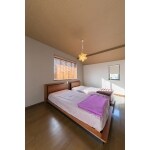 1階のイメージに合わせ、寝室の天井に木目調のクロスを貼った主寝室。奥さまセレクトの照明とマッチして落ち着きのある空間になっています。