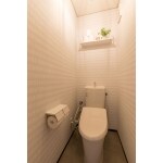 間取りはそのまま、便器も1階の物を再利用した2階のトイレ。 1階とはインテリアイメージをガラリと変えて、北欧テイストのライン柄クロスを使い、ナチュラルな空間に仕上げました。