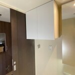 床材、クロスを交換し、明るい空間になりました。 洗濯機上吊り棚も設置し収納力も上がりました。