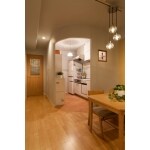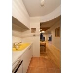 キッチンの可愛らしいアールのたれ壁と床の見切り。ご家族が大好きなカントリー調にふさわしいメープル材とテラコッタタイルのバランスが、よりおしゃれ感を演出。