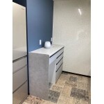 広すぎるキッチン空間を快適な動線にするためキッチン背面(写真、ブルーグレークロス部分)こちらを廊下側から使える収納に間取り変更致しました。 キッチン側は写真の通りカウンター収納を置いてもちょうど良い動線距離で快適になりました。 デザイン性の高いキッチンパネルでコンロ廻りのお掃除もストレスフリーに!