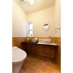 ナチュラルアンティークな雰囲気が漂う空間。タンクレストイレは節水効果があり、お手入れもラクになります。