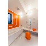 壁やバスグッズにオレンジを取り入れた、オリジナリティのあるバスルーム。 広々とした浴槽でゆったりと過ごせます。浴槽の横に手すりがあるので、座ったり立ち上がる時も安全です。