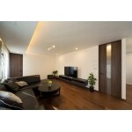 LDKの建築化照明を生かした広々とした空間で、大工にて造作にて天井を作りました。 又、洗面所はユニット式ではなく、全て(1F.・2F)造作洗面にて施工しました。 階段も架け替えに伴う手摺りは鉄骨にてオーダーし、その他内装等はポイントにタイルを張り、空間を演出しました。