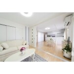可変型のLDK。 現状の折り上げ天井は再利用し、クロスを変えたりモールディング装飾でファンシーな雰囲気をつくりました。 キッチン前の強化ガラスは造作。コスト面、利便性の両方をかなえました。 玄関を少しでも明るくするために、LDKとの間仕切りにアクリル板を造作。