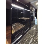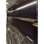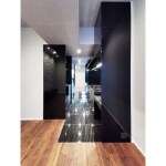 都会的で高級感があり、非日常的な印象のアーバンスタイルを演出するために、黒の大理石調大判タイルと黒鏡面素材でインテリアをまとめました。