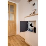アーチの後ろにアウトセット木製扉を制作。 LDKとWICの間のガラスブロックデザイン。 洗面、トイレ以外、ナラ無垢フローリング。 LDKのコープ照明。 おしゃれなクロスの貼り分け。
