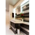 タイルを盛り込んだ造作洗面化粧台をご提案させていただきました。ワークスペースのクロス張り分け、フロアタイル貼り分けを行いました。