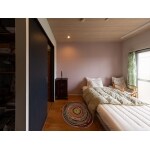 眺めのいい南に面した空間にリビングとダイニングを配置し対面キッチンを提案。キッチンとリビングの間の壁にはお料理をしながらリビングの様子とリビング越しの南側の景色が望めるようガラス窓を設置。また、和室6畳二間分の空間に寝室と小さな書斎、広いウォークインクローゼットを提案し趣味の登山道具などを収納できるようにした。