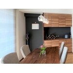 キッチンと同じ色のカフェスタイル収納を設置しました。たくさん収納することができますし、お気に入りの物を飾るディスプレイ棚としてダイニングをお洒落に演出します。 チャコールグレーのアクセントクロスが目を引きます。 この壁にはマグネットボードを内蔵しました。ダイニングテーブル上の照明も素敵です。