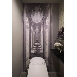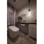 トイレはLIXIL「サティスG」を採用しました。スッキリとした見た目でスタイリッシュなデザインが特徴です。 背面にヨーロッパの宮殿に居るような回廊のデジタル壁紙を貼っています。実際の広さよりも奥行きを感じる工夫を施しました。手洗い器の上はリーフ状の艶やかなガラスタイル、陰影が美しいペンダントライト、ガラスの飾り棚など1つ1つコーディネートしています。 こだわりとご夫婦の思い出が詰まったトイレは美しく特別な空間に仕上がりました。