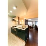 濃緑色のキッチンがおしゃれ。天井にも注目!