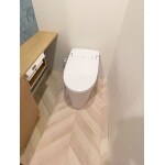 LIXIL サティスリトイレSタイプ SR6グレードにお取替え。 明るくスッキリとした手洗器「キャパシア」セミフロートキャビネットも設置しました。 大型パネルで配管類を隠してトイレ周りがスッキリします。 床は、サンゲツのクッションフロアをお選びいただきました。 ウッドの上品な色の変化と優しい節の表現が使いやすいフレンチヘリンボーン柄です。 アクセントクロスは、小説で描かれたアート壁紙をお選びいただきました。