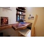 廊下を無くし、扉を開けると広がるLDKの一角にワークスペースを確保しました。カウンターはダイニングテーブルとして使用していたお気に入りのウォールナットの銘木板をリメイクしたものです。また、家事室と隔てる壁に、奥様が旅先で作られた思い出いっぱいのステンドグラスをはめ込んでいます。 思い入れのある家具を再利用したいという施主様のご希望を叶えた、思い出とこだわりが詰まった空間が完成しました。