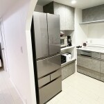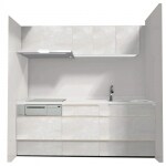 収納力のあるカップボードを置くことですっきりとお片付けがしやすいキッチンに。