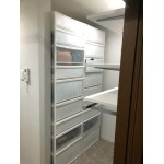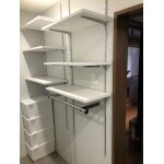 収納スペースが増えるように可動棚や今までよりも大きな段数の多い引き出しの設置をご提案いたしました。 またクロスの張り替えをすることで、ダウンライトが映える清潔感ある空間に仕上げました。