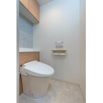 背面に収納キャビネットがついたトイレをご提案。トイレットペーパーや掃除用具などをすっきり収納することができます。 内装を明るめの色でコーディネートし、空間を広く感じることができます。
