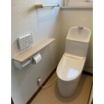 交換後のトイレ 手洗付きのスッキリとしたデザインのトイレへ交換 壁紙を白くすることで空間が明るく広く見えます。
