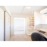 大人4人フルタイムで仕事をし、協力し合いながら幼いお子さんと暮らしているご家族。家族みんなが快適に過ごせるLDKとするために、まずは収納不足の解消をご提案。リビングに溢れたおもちゃや生活用品を収納するキッチン北側の大きめ収納により、LDKに団欒のスペースを確保。毎朝仕事へ行く前に晩御飯の支度と洗濯をこなす奥様とお嫁様のために機能的なキッチンと効率的な家事動線を提案。各所必要な量の収納を配置し、室内干し場を十分に確保すると共に、内装材に調湿効果と消臭効果のある漆喰と無垢材を採用して洗濯物の部屋干しにも配慮しました。