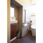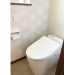 隣の納戸の間仕切りを移動して、トイレ間口を拡張しました。解体時に壁の裏側に2階の配管スペースを発見し手洗い位置の変更で対応しました。