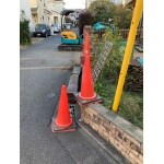玄関先に移動しました。雨の日でも濡れる事なく取り出せるように。フェンスと同じ色のオレンジチェリーで統一感もあります。 玄関の階段は一部スロープを設置しました。