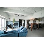 バイオエタノール暖炉を採用し、暖かさ・炎の美しさ・癒しを都会的に演出しています。 天井が高くなり、色のトーンが統一され空間の広がりを感じます。梁がアクセントになっています。