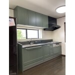 W2700はそのままに機器の入替をさせて頂きました。 トクラス ベリーのグリーンクラフトの扉面材にサンドブラックのカウンター、レンジフードを黒にして更に渋いキッチンが出来上がりました。中央部分の作業スペースは88cm程度に広がりました。