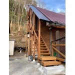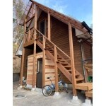 木製外部階段と2Fに勝手口を作り、階段下には天然木を使用したトイレ建物を増設しました。階段の頭上には屋根と雨樋を設け雨の日も快適です。