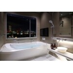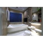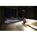 タワーマンションの高層階にお住まいで浴室の窓からの眺望が非常にきれいでしたので、入浴中に夜景を楽しめるプランを提案させていただきました。 ステップ付きのワイド浴槽は、浴室内のステップに腰掛け、半身浴しながら景色を眺めることができます。 さらに明るさを調節できる照明を取り付け、夜景を眺める時は、少し暗めに設定することで、より美しさが際立つようにしました。