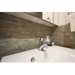 収納箇所が少なく閉鎖的に感じていた洗面脱衣所を広げるため、隣接していた洋室のクローゼット部分を空間に取り込みました。 そのスペースに高さが調節できる可動棚を設け、タオル以外にも体重計、洗濯かごなどすっきりと整理できるように。 ボウル、棚板を組み合わせたシンプルな洗面台にアクセントとして名古屋モザイクタイルの「イリーデ」を施工したことで、大人シックでお洒落な洗面スペースが仕上がりました。
