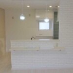 ご要望通り対面キッチンのプランでご提案。開放感を出すために吊戸棚は付けていません。キッチン前にはカウンターを設けて、ちょっとした食事ができるようになっています。