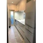 キッチンから玄関に行くドアがあり、壁が非常に使いにくかった為ドアを撤去し一面壁にして、 周辺ユニットをきれいに納めることができました。 玄関側の壁一面にクロスを貼りましたが、違和感なく仕上がりよかったです。 キッチンの床をクッションフロアではなく、メラミンタイルにして高級感がでました。