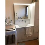 洗面化粧台の右側に巾木の厚み分 目地板をはさみキレイな仕上がりと引き出しが引きやすくなるようにこだわりました。