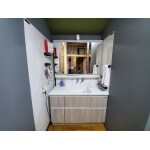 間口120cmの洗面化粧台を右寄せで設置。左側には、約8cmの隙間が生じますが、お客様は快く承諾してくださいました。引出タイプになったので収納量もUP!!両壁には、タカラのホーローパネルを設置しているので、マグネット収納が取付け可能。マグネットだと配置変更が可能なので、奥様がとても喜んでいらっしゃいました。