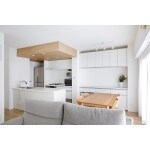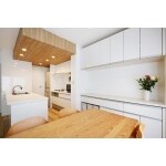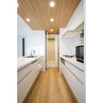 壁を撤去しオープンキッチンにしました。対面でありつつ、キッチンの横にダイニングテーブルもおける配置を考えた結果、流しとコンロが分かれた2列型キッチンを採用いたしました。ダイニング側の壁にも、キッチンと同じ扉材の壁面収納を作り、調理グッズや食器もすべて収められるようにしました。天井のふかし部分に、木目調のシートを貼りました。アクセントになるだけでなく、ゆるやかに空間を分ける役割もあります。木目シートはフローリングと合わせて長手方向に揃え、奥行きを感じるようにしました。扉の先は洗面室と浴室につながり、家事動線もスムーズです。