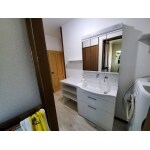 洗面室が細長で狭いので、洗面化粧台をスリムタイプにして広くしたい。 洗面器とカウンターのつなぎ目のない物をご希望。