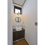 ベッセルタイプの洗面をご提案。水はねを考慮し洗面廻りをタイル貼りとしました。