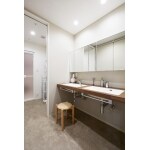 2階、3階は造作洗面台と工夫した収納スペースを設置しました。 どちらもお選びいただいた洗面台 AICA ボウル付き「スタイリッシュカウンター」は、ラバトリーボウルをフラットに一体接合した洗面カウンターで天板とボウルの継ぎ目の段差もなく、日々お手入れがしやすい商品です。 造作洗面によってシンプルな印象ですが、 3階の洗面台下にはPanasonic 耐水カウンターを設け足元がすっきりしながらもミラー背面には収納できないタオルや小物を置くことができます。 また、洗濯機横に設置した南海プライウッドの可動棚はたっぷりと収納でき上部にはさっと目隠しができるロールスクリーンを取り付けました。 こだわりの商品や工夫した収納スペースの組み合わせにより家事のストレスを軽減し、生活動線を考えた素敵な洗面脱衣所に仕上がりました。