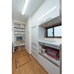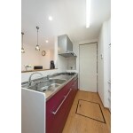 西側と北側を少しずつ増築してスペースを広げたことで、対面キッチンを実現しました。増築した西側はパントリーに、北側はカップボードと家電収納になりました。 全体的にナチュラルなデザインで統一されたLDK空間ですが、キッチンの扉カラーだけは奥様の好きな赤色を採用。