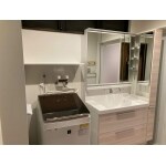 洗面台の仕様は今までと同じ形ですが、収納を右側に寄せて空間を遮らないようにしました。