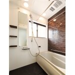 アクセントパネルの木目が見た目もあたたかな浴室。