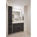 トールキャビネットを設置する事で収納量を補い、スッキリとしてお掃除もラクになりました。グレーストーンの扉がスタイリッシュな空間を演出します。