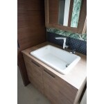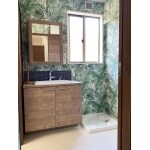 洗面室がフラットにLDKに繋がりました。最後までこだわった引き戸を開けると、大胆な壁紙がチラ見えで風通しのよいステキ洗面室になりました。