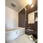 シックなカラーのアクセントパネルで落ち着いた印象のバスルーム