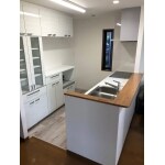 カップボードは統一感を持たせるため、同じメーカーで ご提案させて頂きました。 食洗機は水道代も節約出来て、作業効率もアップの優れものです。