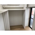 スペースは少し狭くなってもいいので、ウォークインクローゼットとして作り直しましょう。2面に窓があるので西側の窓は室内側からふさいで壁としてしまえば収納力があがります。 棚はあえて頭の高さの枕棚のみの設置としています。その方が洋服が最大限かけられますし、今後、収納箱や大きなものの納めにも柔軟に対応できます。いろいろな物が掛けられるように頭の高さに撤去可能なハンガーパイプを設置しておきます。 服をかけたり、S字フックを用意して好きな物の物干しなどができます。 少しポップなデザインのストライプ柄クロスがお部屋全体のテイストを明るくしてくれています。