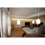 写真右奥が元々和室があったスペースでした。壁一面にエコカラットを施工しています。間接照明でエコカラットが映える優雅なLDKに。