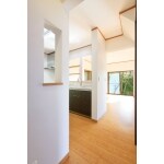 キッチンから各室への見渡しをよくするため、壁の一部を開口し、飾り棚としても使えるように棚板を設置。機能性にデザインもプラスしたご提案です。
